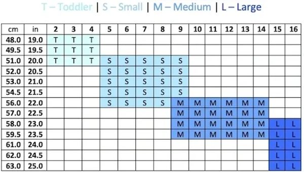 Please use the chart to determine the best size helmet. Similar to measuring your child's shoe size for the correct fit, measuring the circumference of their head is essential for a proper fitting helmet!